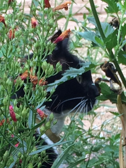 My little Tuxedo kitty, Bubu, loves to be outside in our garden! Although he is not allowed to go outside alone, and must be supervised. Otherwise he is up and over the fence in a heartbeat, and with the wild animals that roam our neighborhood, that’s not a chance I’m willing to take.