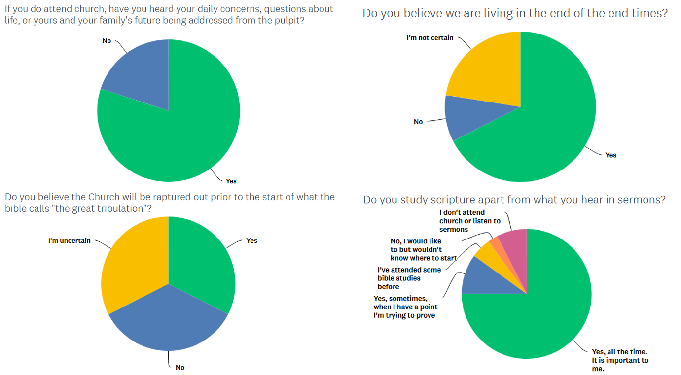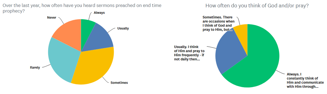 Although the majority of respondents believed we are living in the end times, 78% noted that in the past year they have heard sermons preached on the end times sometimes (32.5%), rarely 27.5%), or never (17.5%). 22.5% noted they hear end-time oriented sermons usually or always.